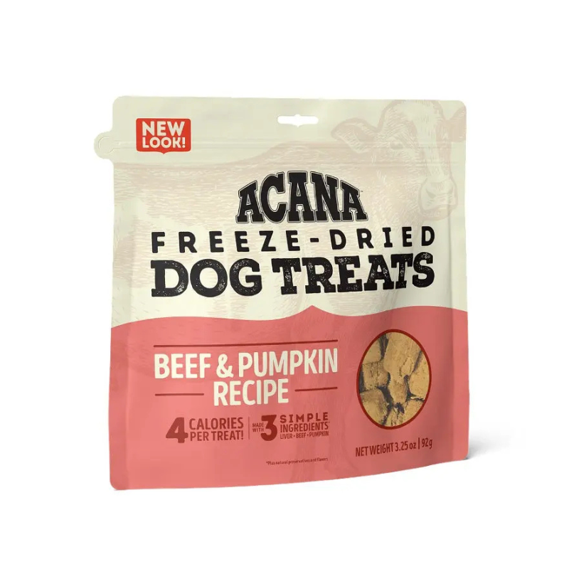 Rich with animal protein and flavour, ACANA™ Singles Freeze-Dried Treats are a nutritious and tasty anytime reward for your dog. Our Beef and Pumpkin Recipe is made with three simple ingredients, including nourishing beef liver, beef, and delicious whole pumpkin, so you can feel good about treating your dog. And at just 4 calories per treat, they’re perfect for training! Freeze-dried to lock in protein-rich flavor, these treats will have your dog drooling as soon as they see the bag.