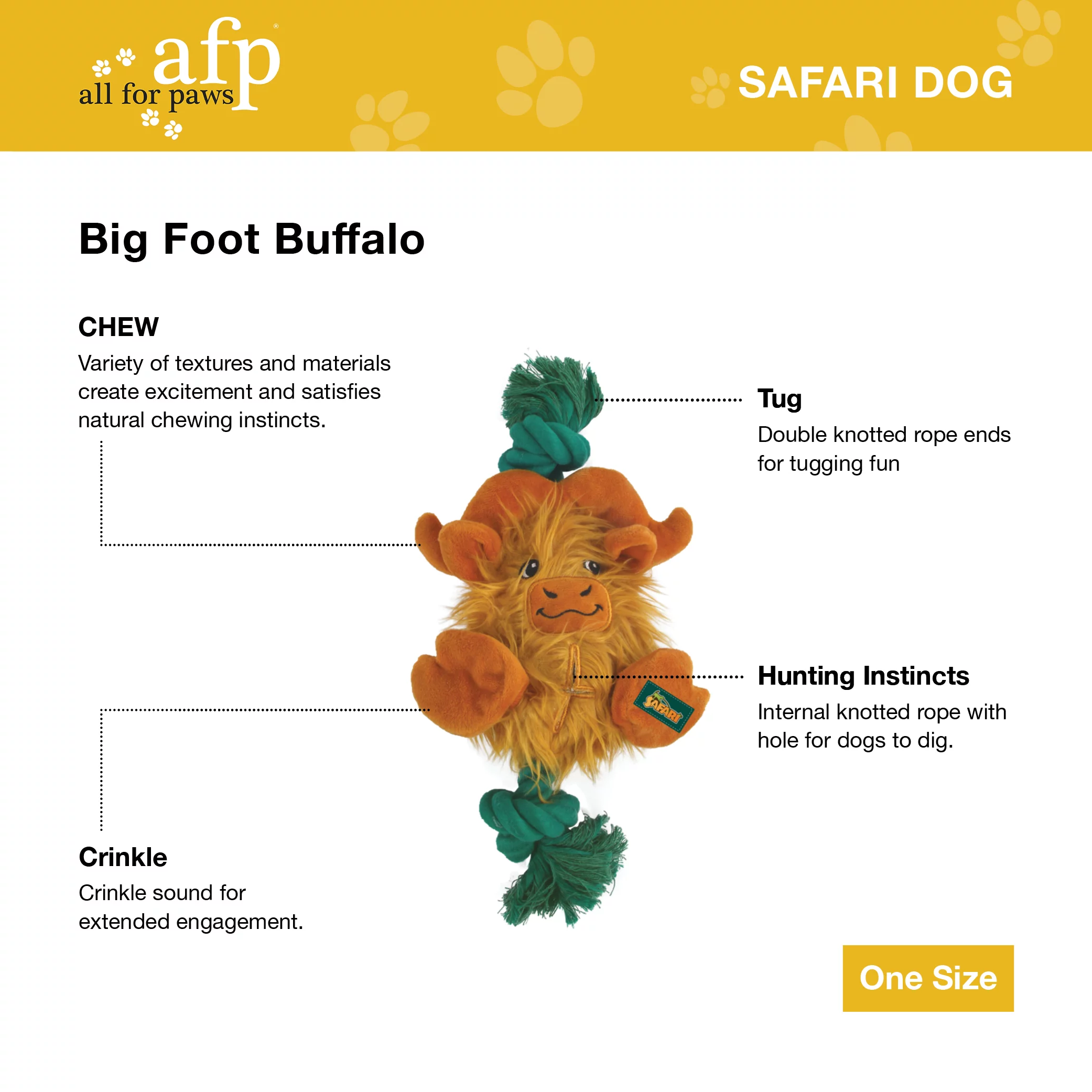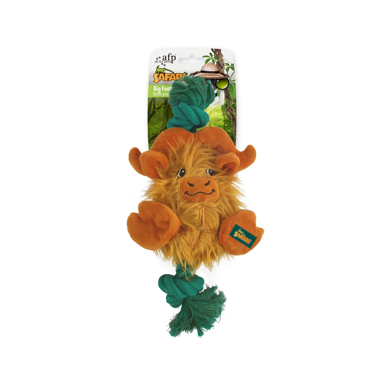 This knotted plush toy is a great tug toy for you pet to engage in solo play or to play with you. The knotted rope on both ends allows for tug fun, while the hole in the middle allows for the dog to dig at the internal knotted rope and satisfy their natural chewing instincts. This cute Big Foot Buffalo is made of a variety of materials and textures to create additional excitement. |