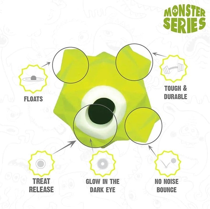 The Monster Treat Release Toy™ is tough, durable, and gentle on teeth. It is perfect to incorporate in water play as it also floats. The Monster Treat Release Toy’s eye glows in the dark. This toy is made of DURALITE material and has a no-noise bounce. Keep your pup busy with this fun fetch and rewarding treat toy!
