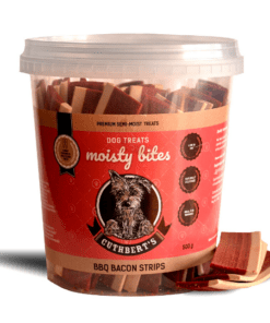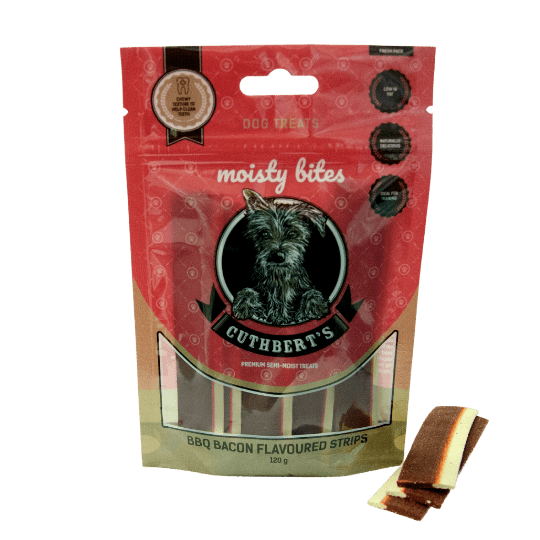 Cuthbert’s Semi Moist BBQ Bacon Strips are available in a 500 g tub and a 120 g pouch.