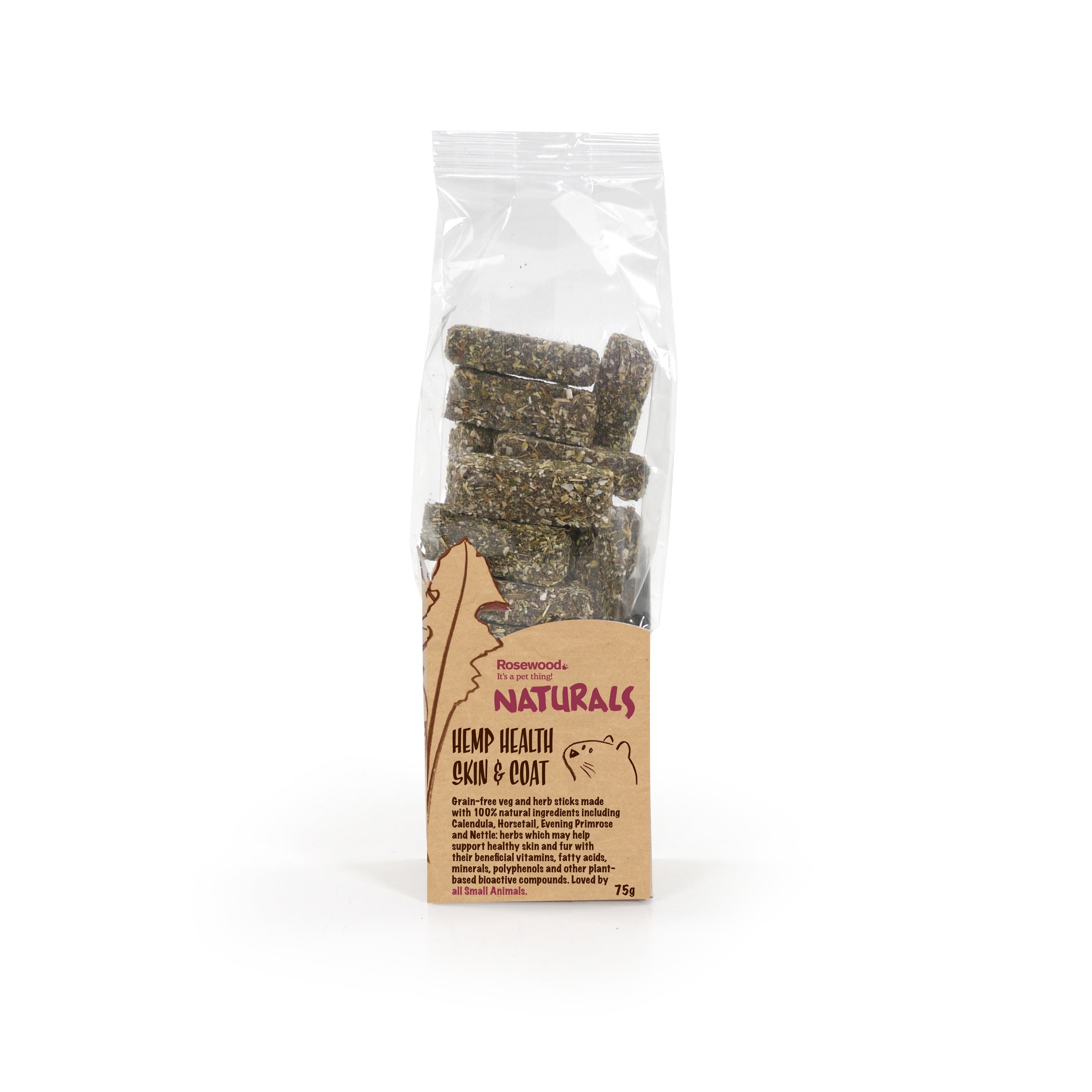 Our new, grain-free mini-sticks are ideally sized for healthy portion control and are made with 100% natural ingredients, including herbs and vegetables which can help support wellness with their beneficial vitamins, fatty acids, minerals, polyphenols and other plant-based bioactive compounds. Additionally, we add ground hemp seed – the ultimate superfood – which is rich in digestive fibre, quality protein, minerals, vitamins and unique phytochemicals; plus, its a rich and balanced source of supportive omega 3 and 6 fatty acids. The Skin & Coat has beneficial calendula, horsetail, evening primrose and nettle. It is highly palatable and ideal for all small animals.