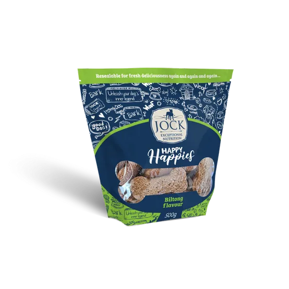 JOCK Happy Happies treats are the perfect complement to our scientifically formulated dog food range. These delicious and nutritious treats are ideal for rewarding, teaching, and reinforcing good behavior. Our big and small happies are the perfect size for both small and large dogs, making them a suitable treat for all dog breeds. Available in three truly South African flavors – Boerewors, Braaivleis, and Biltong.