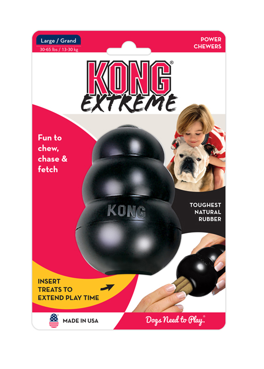 The KONG Extreme dog toy represents the most durable strength of KONG rubber. Designed for the toughest of chewers, the KONG Extreme offers enrichment and helps satisfy dogs’ instinctual needs. The KONG unique, ultra-durable, all-natural rubber formula is designed for determined chewers, while the erratic bounce fulfills a dog’s need to play. Want to extend play time? Be sure to stuff with tempting bits of kibble and entice with a dash of peanut butter.