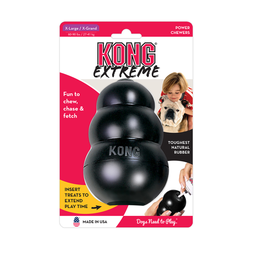 The KONG Extreme dog toy represents the most durable strength of KONG rubber. Designed for the toughest of chewers, the KONG Extreme offers enrichment and helps satisfy dogs’ instinctual needs. The KONG unique, ultra-durable, all-natural rubber formula is designed for determined chewers, while the erratic bounce fulfills a dog’s need to play. Want to extend play time? Be sure to stuff with tempting bits of kibble and entice with a dash of peanut butter.