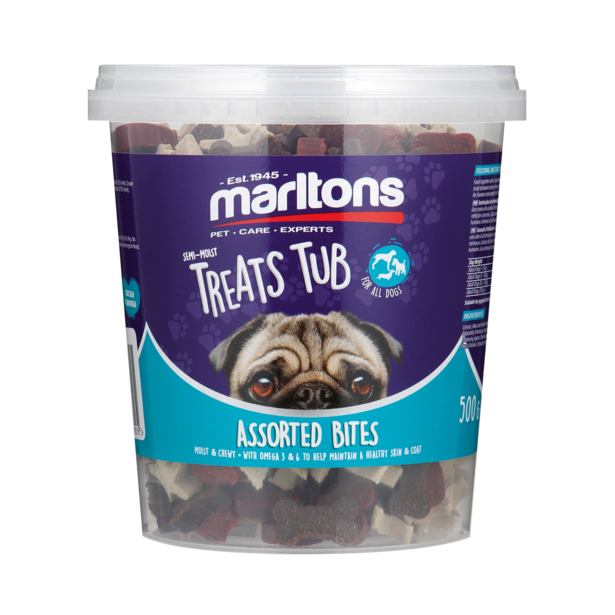 Treat for all dogs. Moist & chewy. With Omega 3 & 6 to help maintain a healthy skin and coat. Packaged in convenient tubs.