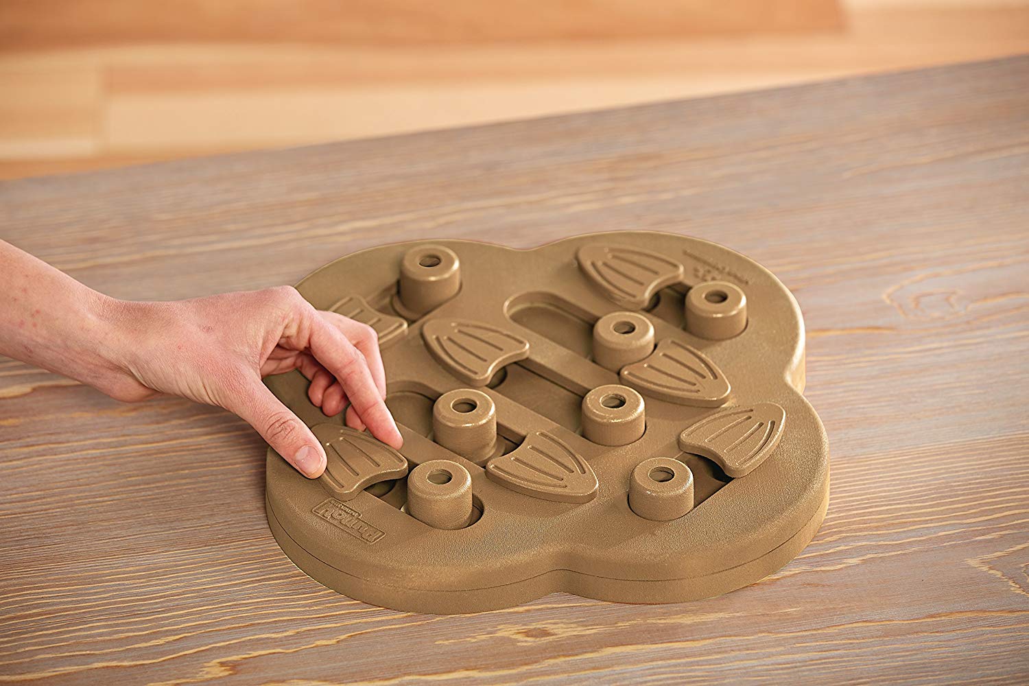 HOW TO PLAY: Place treats in circular blocks and compartments in the base. Swivel flippers to cover tracks. Place game on floor and encourage your pet to seek treats. Dogs are smarter than you think. Sometimes we just need to teach them! Swivel flippers off the track to make this game easier and show your dog how the blocks slide.