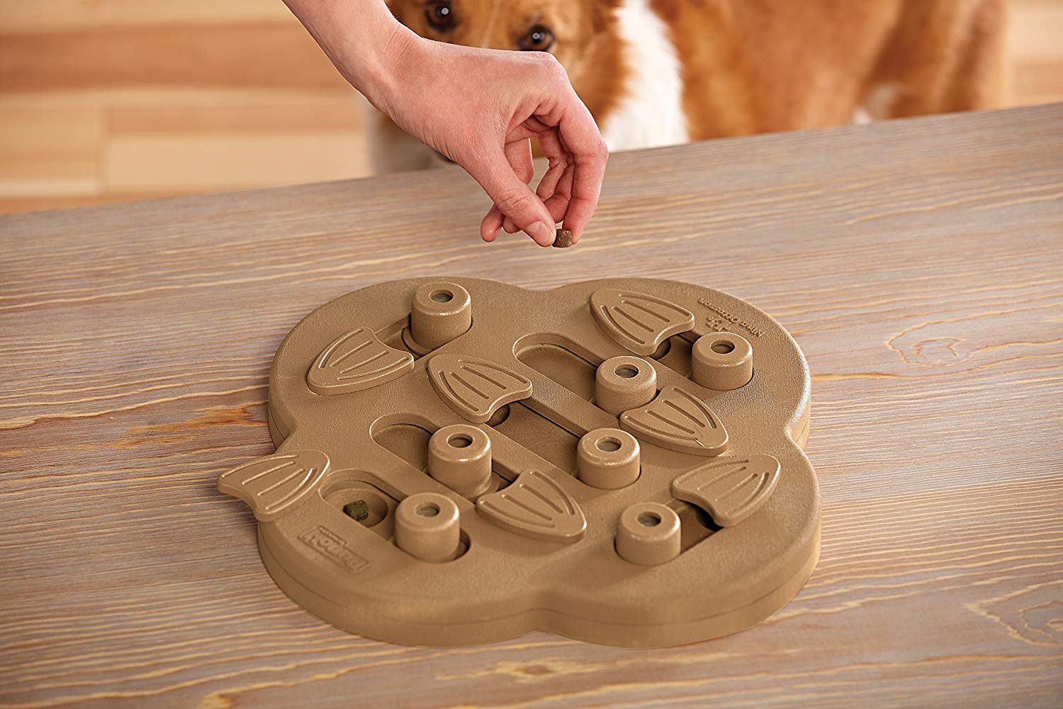 IT’S ALL IN THE NAME: Simple enough, just hide treats in each compartment of this dog training game and watch as your dog slides around the pieces to find them. NO REMOVABLE PARTS: This dog game has built in pieces that stay in place during play.