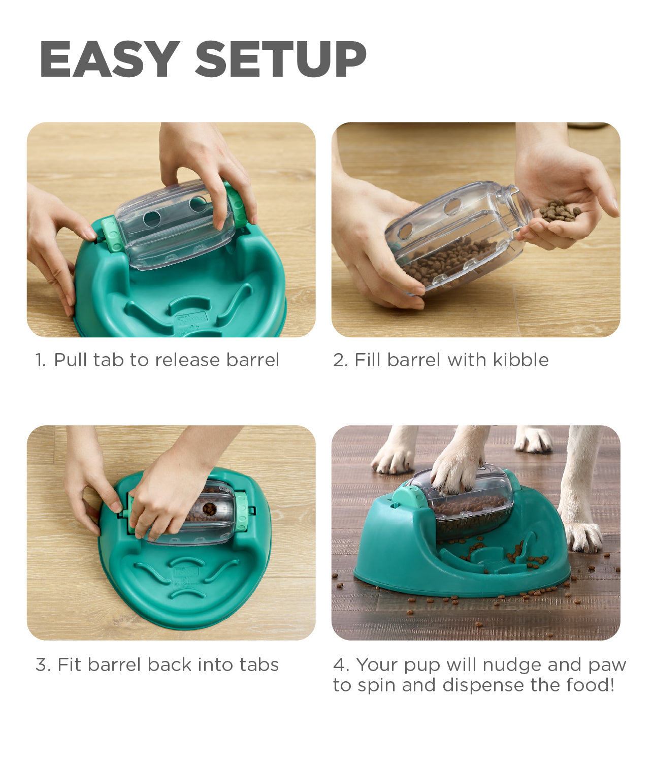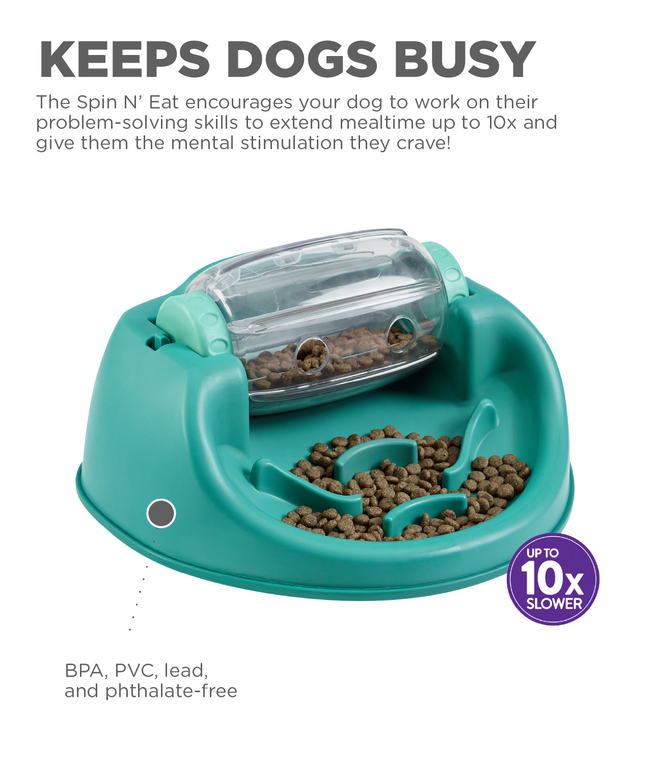 Make mealtime fun and exercise your dog’s mind by replacing your standard dog bowl with a puzzle feeder! The Dog Spin N’ Eat dog puzzle holds up to 2 cups of food. It keeps dogs busy by encouraging your dog to work on their problem-solving skills. The mental workout from this level 2 dog food puzzle feeder fights boredom and extends mealtime, giving them the mental stimulation they crave. It’s easy to use! After filling the barrel with dog treats or kibble, put the game in front of your dog. Your pup will learn to release the food by nudging or pawing the barrel to get it spinning. The Dog Spin N’ Eat puzzle feeder is made with food-safe materials and is BPA, PVC, lead, and phthalate-free.