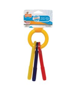 The keys to puppy happiness: chew, chew, play! Bacon flavoured Puppy Teething Keys Dog Chew Toy from Nylabone is made from a soft, thermoplastic polymer that’s safe for teething puppies without permanent teeth.