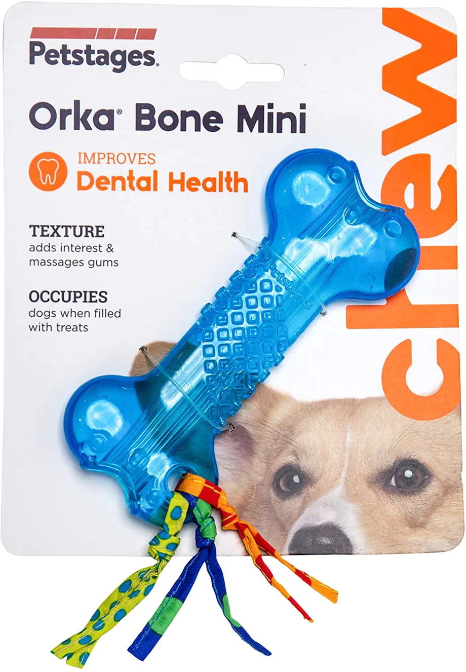 Mini Orka Bone by Petstages® has multiple textures to massage gums and keep your pup’s interest.