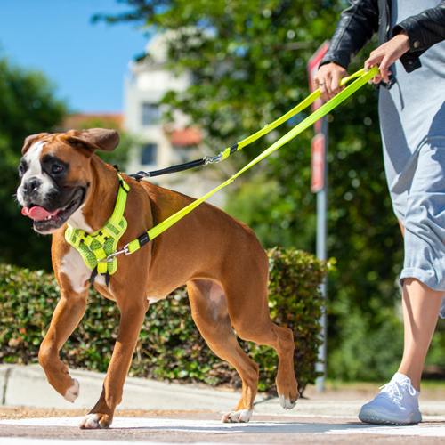 2. Multi Lead attachment on the front chest pad for Stop-pull control and Two-point steering. A stow-away elastic loop ontop of your dog’s back holds the O-ring and puff rope in place while your dog is off lead.