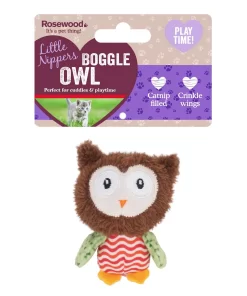 The Rosewood Little Nippers Bogle Owl Cat Toy is made from Super soft plush, this cat toy is perfect for comforting snuggles as well as active play time! Crinkle wings to spark your cats interest. Packed with catnip to kick start your cats natural batting, pouncing and chasing instincts. Great for both interactive and solo play!