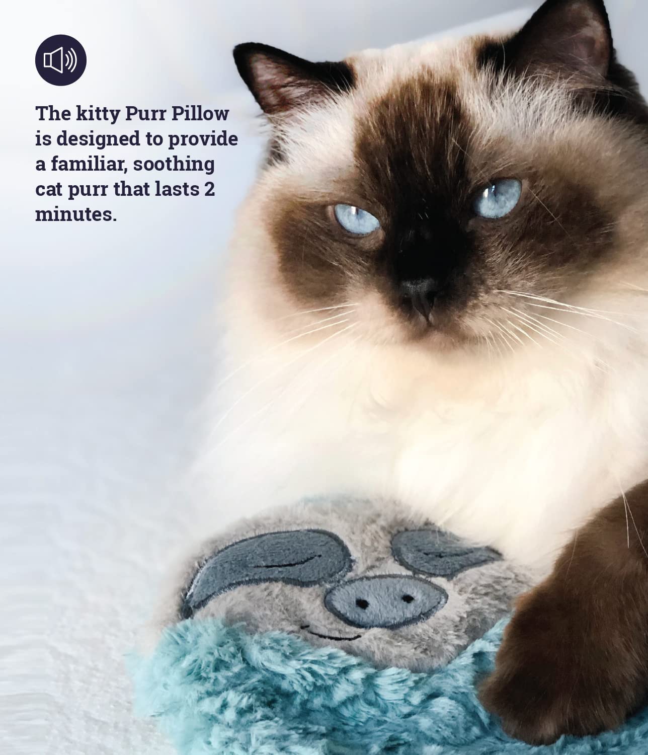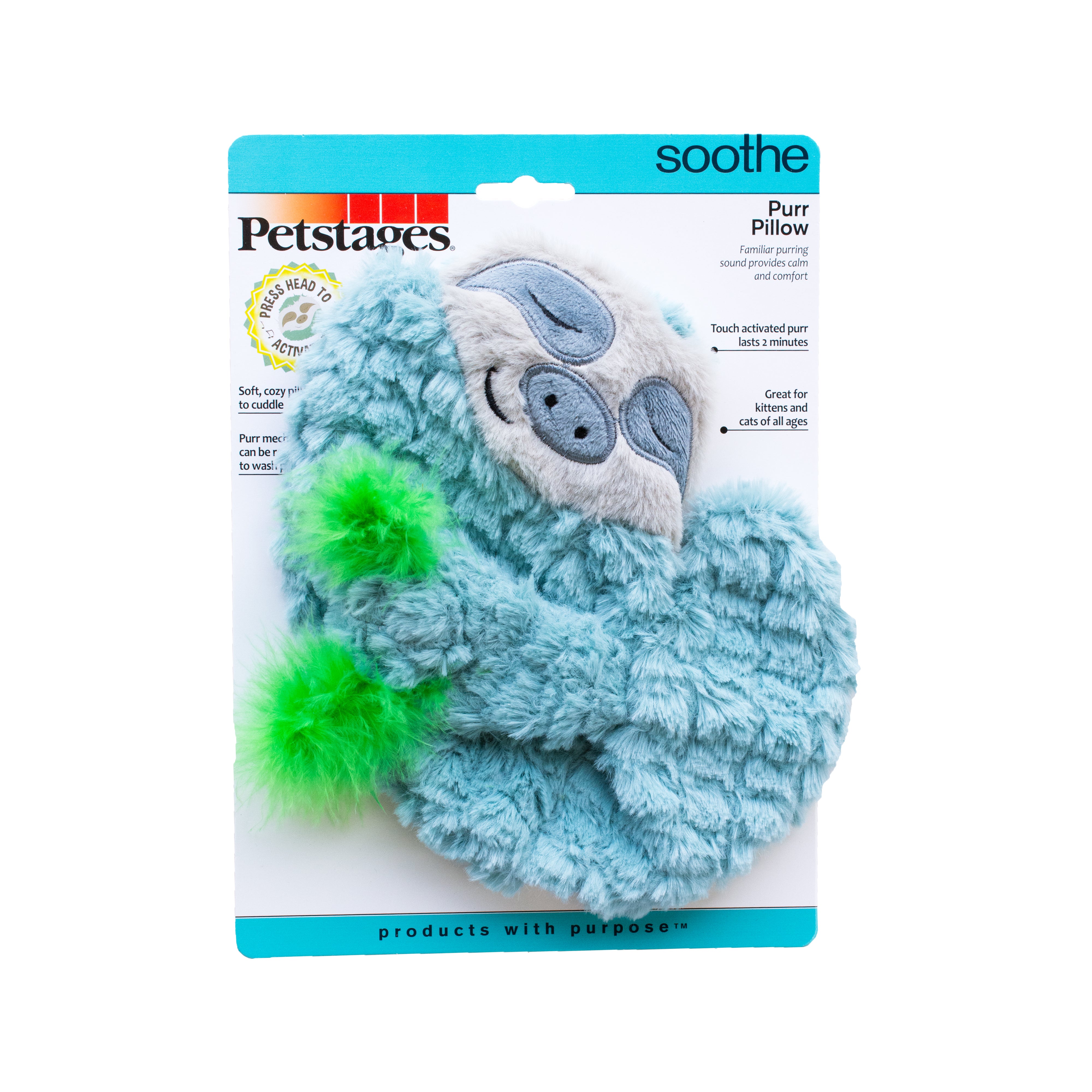 - Touch activated purr: The sloth Purr Pillow is designed to provide a familiar, soothing cat purr that lasts 2 minutes each time the toy is squeezed or cuddled.