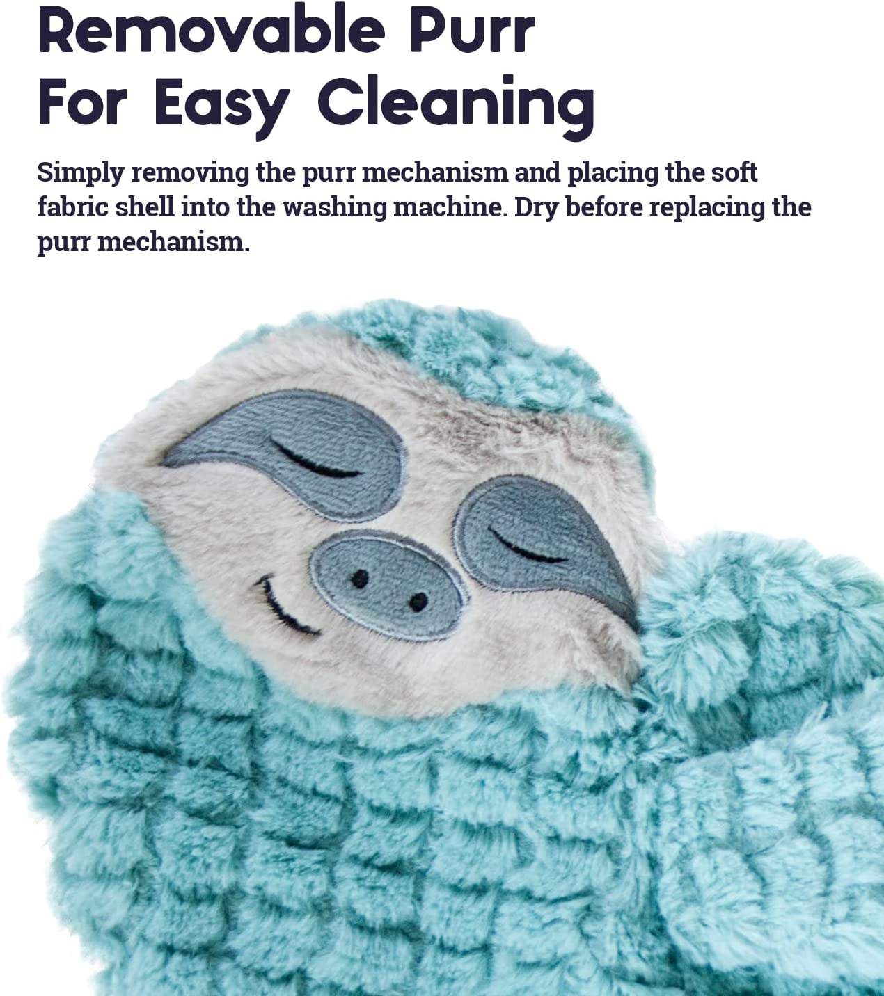 - Removable purr for easy cleaning: Keep your kitty’s favorite new cuddle toy clean by simply removing the purr mechanism and placing the soft fabric shell into the washing machine. Dry before replacing the purr mechanism.