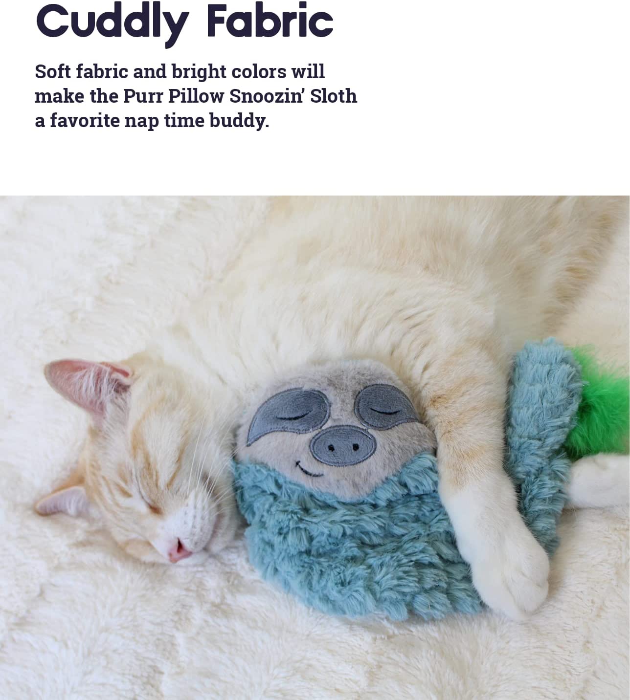 - Cuddly fabric: Soft fabric and bright colors will make the Purr Pillow Snoozin’ Sloth a favorite nap time buddy.