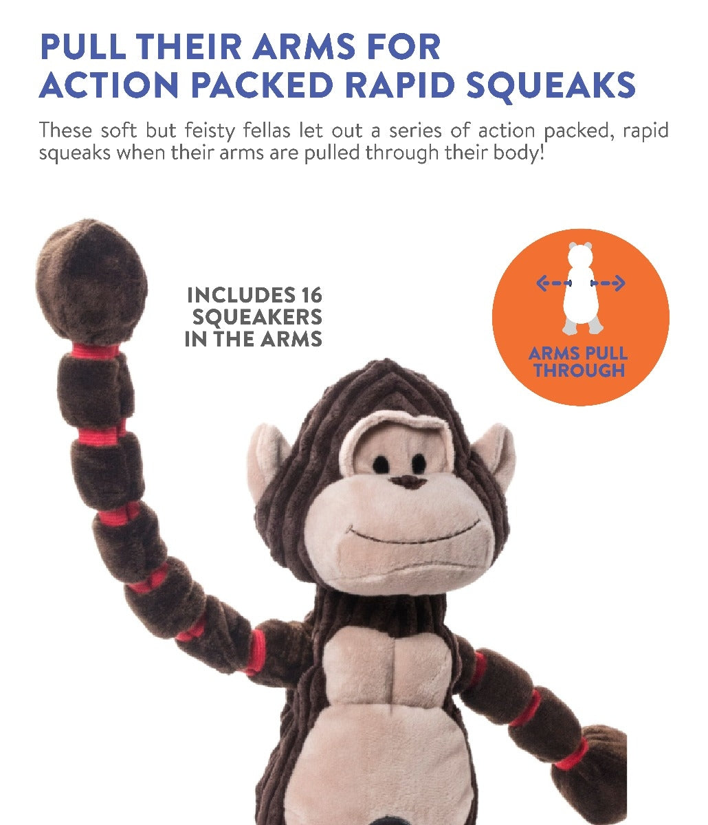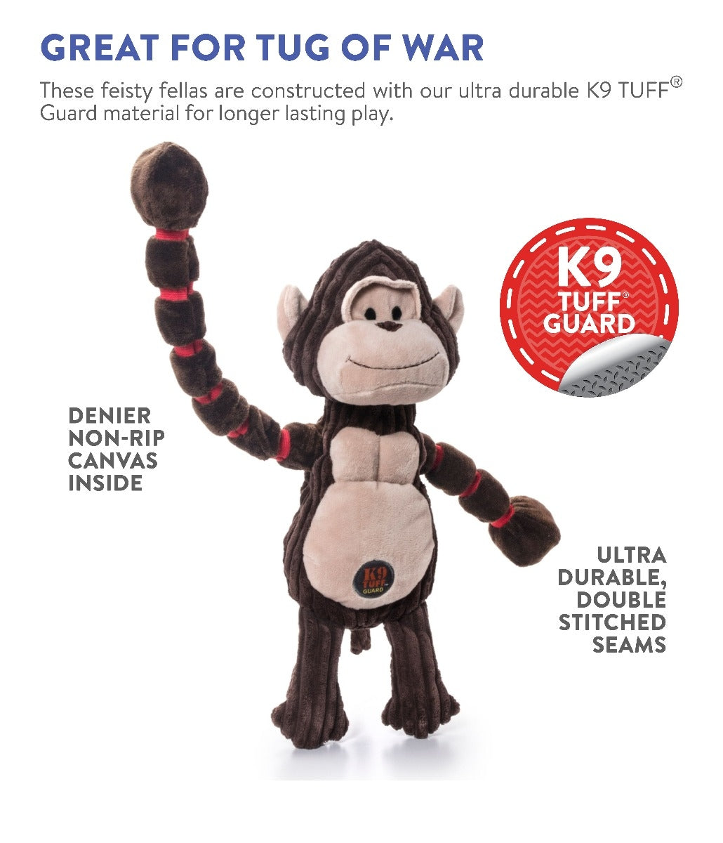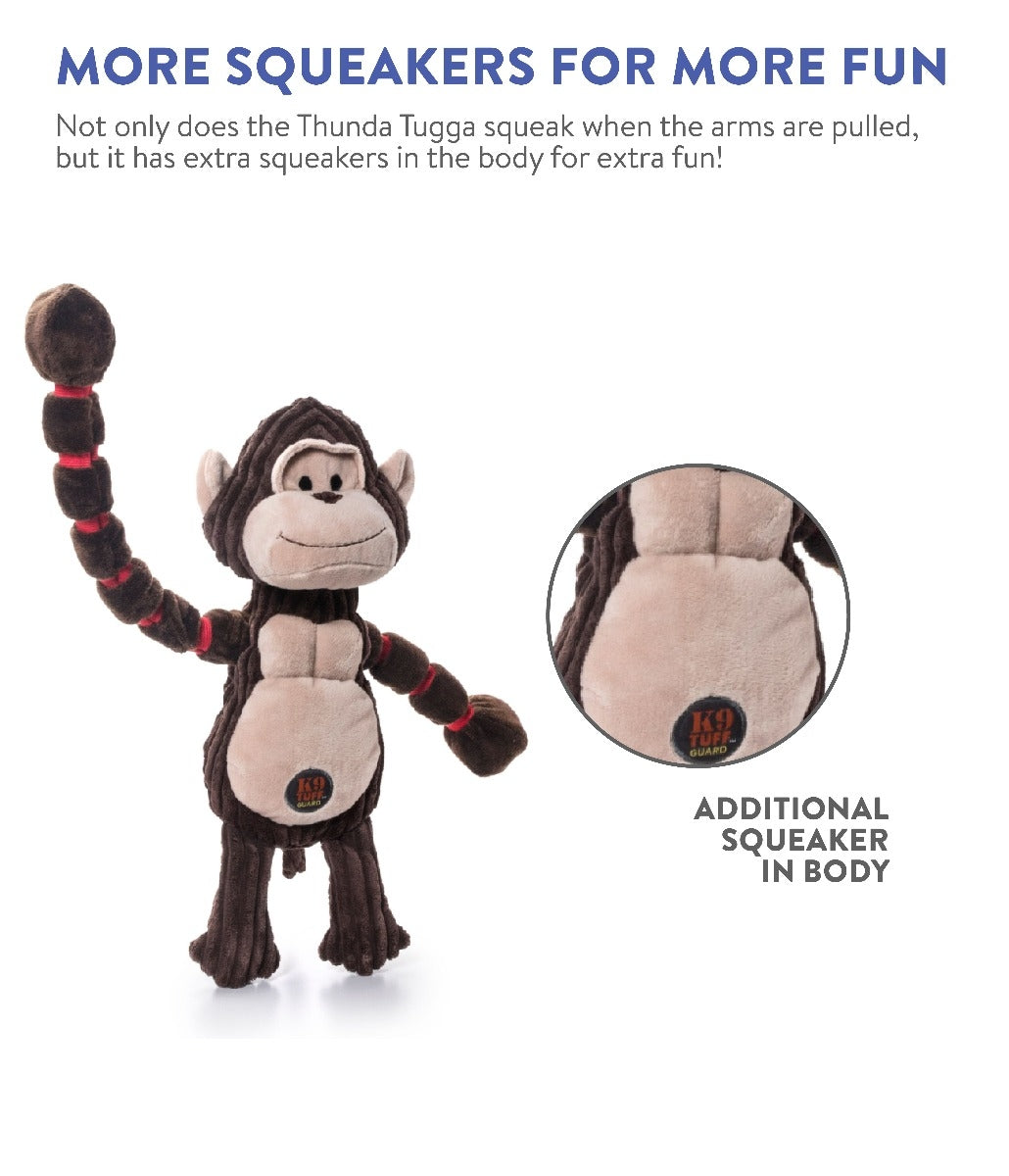 Ready, set, tug! Our plush & corduroy Thunda Tugga appears soft & sweet, but this feisty fella lets out a series of action packed, rapid squeaks when its arms are pulled! Your pooch can munch, bite, chew, and squeak its way to canine bliss. Durable K9 Tuff ™ Guard makes this toy the perfect companion for your best friend.