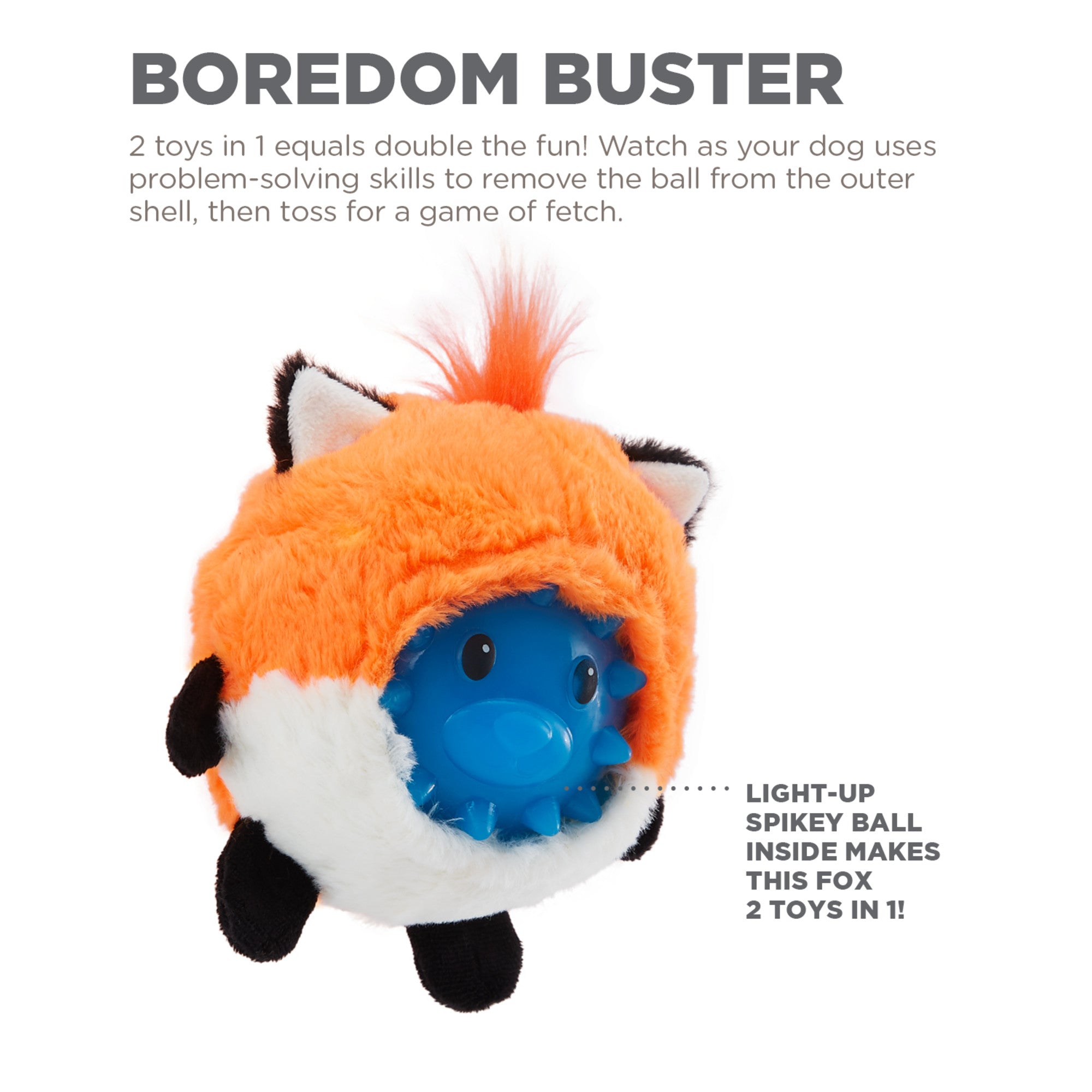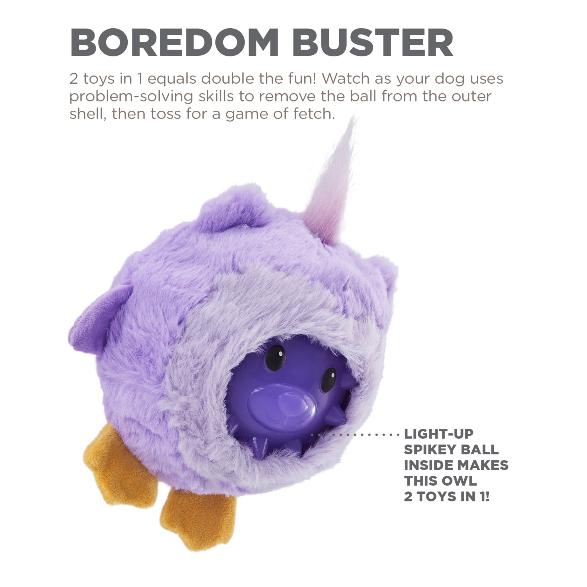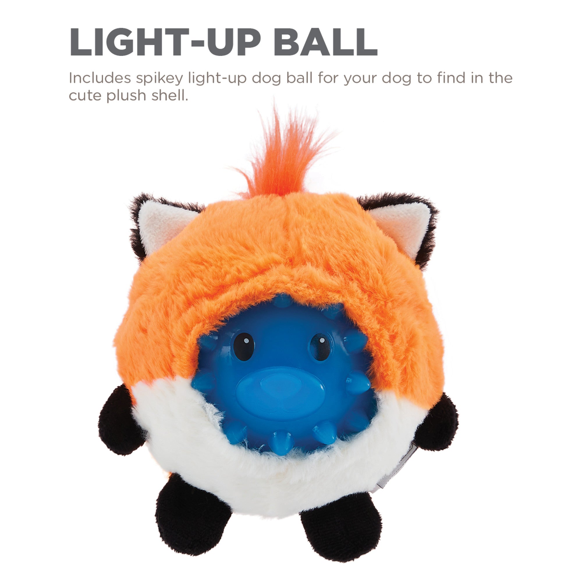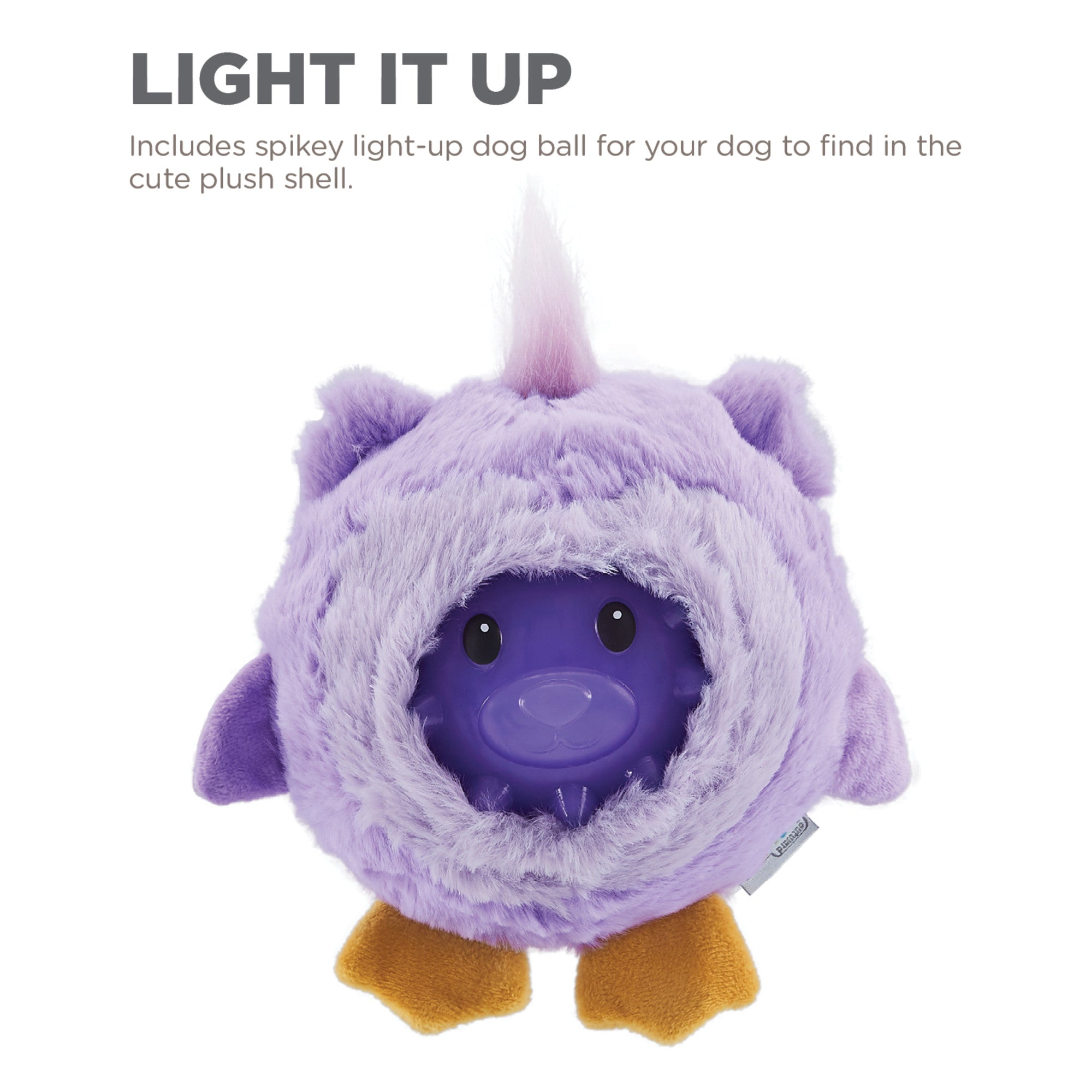 • LIGHT IT UP: Includes a spikey light-up dog ball for your dog to find in the cute plush shell. Includes batteries. Batteries not replaceable.