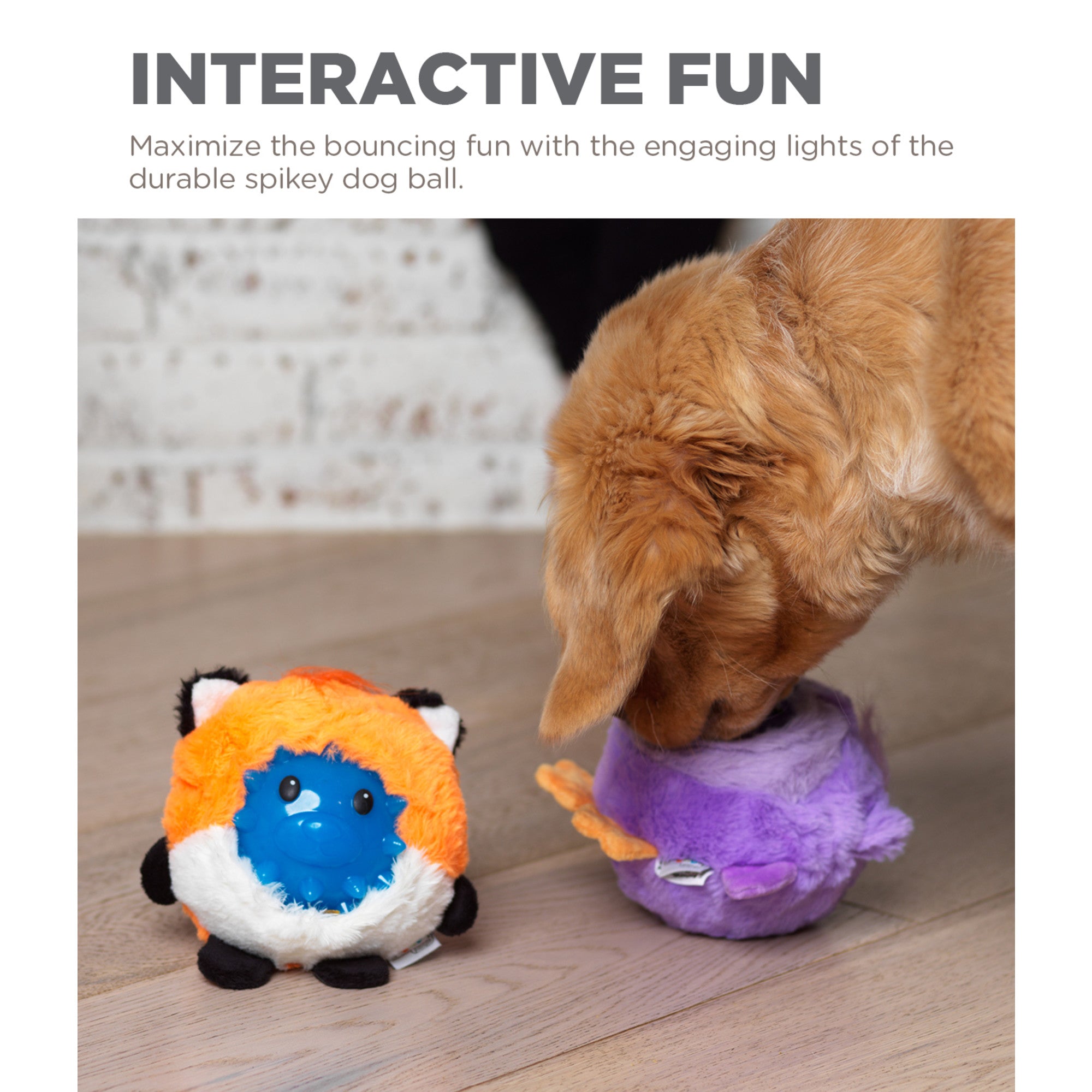 • INTERACTIVE FUN: Maximize the bouncing fun with the engaging lights of the durable spikey dog ball.